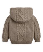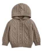 Ez a bájos, barna színű sodrott mintás kötött kardigán ideális választás rétegezéshez hűvösebb napokon. Meleg kapucnija extra védelmet nyújt, az elöl végigfutó gombos záródás pedig megkönnyíti az öltöztetést. A bordázott szegélyek és ujjvégek kényelmes és jól illeszkedő viseletet biztosítanak a kicsiknek.