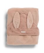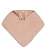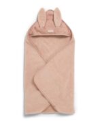 Nyuszifüles, puha frottír belsővel és jersey külsővel rendelkező, sötétrózsaszín színvilágú kapucnis törölköző.