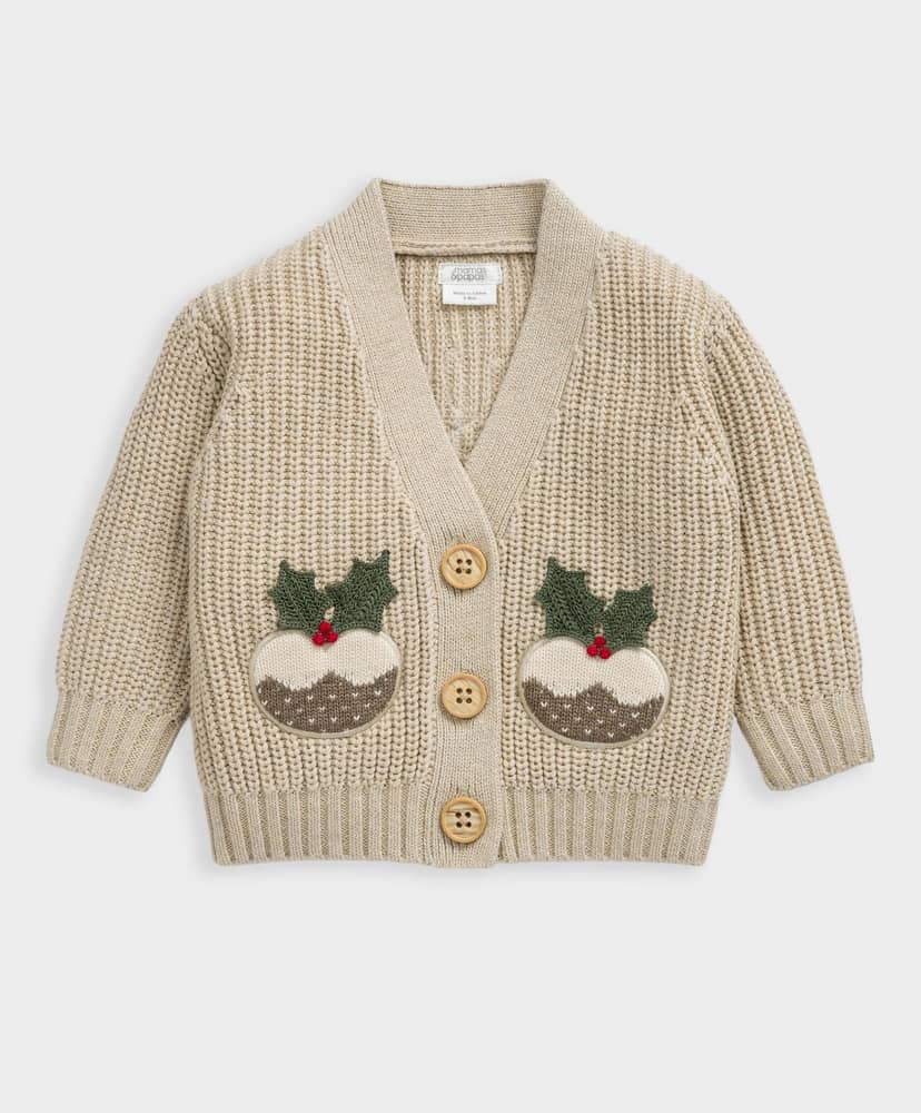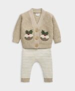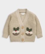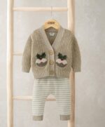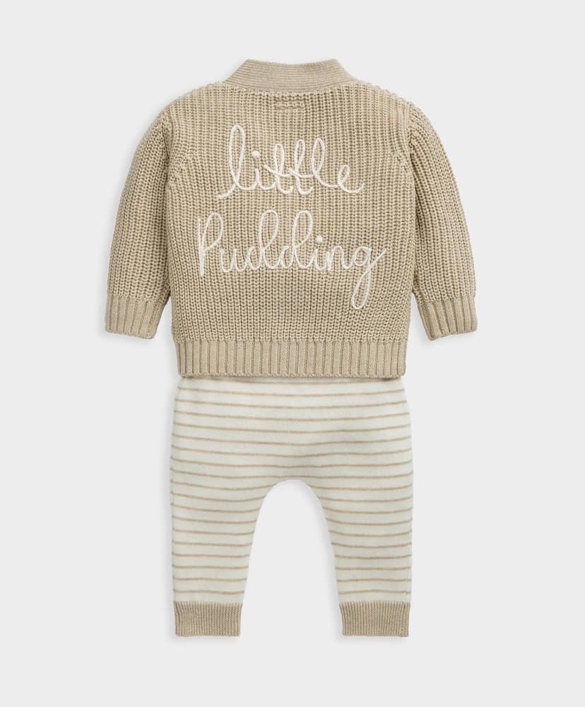 Ez a pihe-puha, kétdarabos kötött szett garantáltan mosolyt csal mindenki arcára az ünnepek alatt. A vastagkötésű kardigán elején egy karácsonyi puding díszítés, hátul pedig hímzett „Little Pudding” felirat teszi igazán különlegessé. A hozzáillő csíkos leggings kontrasztos passzéval egészíti ki ezt a vidám és meleg összeállítást – tökéletes karácsonyi pillanatokhoz!