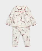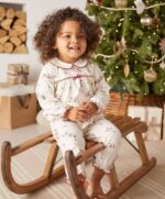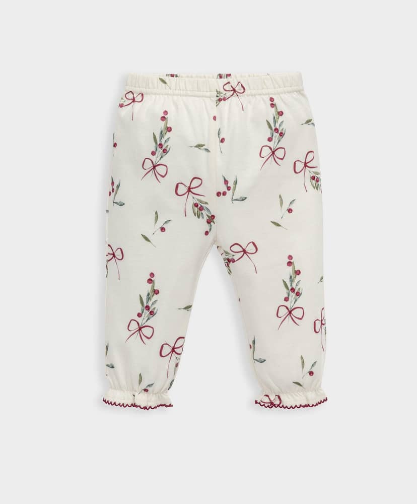 Varázsold még ünnepibbé az esti rutinokat ezzel a csodaszép és kényelmes karácsonyi pizsamával! A puha pamutjersey felsőt bájos fagyöngyminta, fodros gallér és apró masni díszíti, míg a hozzáillő nadrág fodros szárvégei és rugalmas dereka biztosítják a kényelmet egész éjjel.