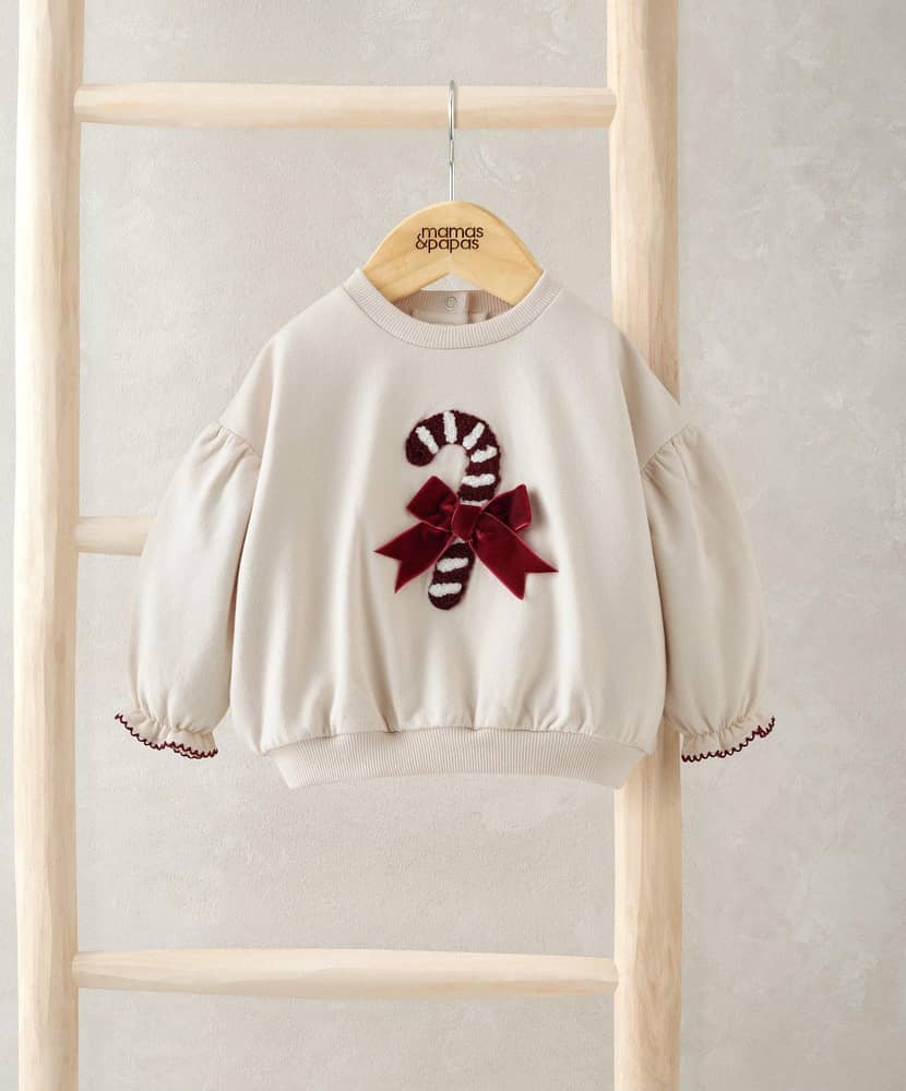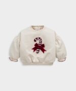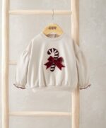 Ez a bájos karácsonyi pulóver garantáltan feldobja az ünnepi hangulatot! A nyalókás minta boucle és hímzett részletekkel díszített, a finom masni és fodros mandzsetta pedig igazán különlegessé teszi. A hátul rejtett patentos záródás megkönnyíti az öltöztetést, miközben a puha pamut anyag egész napos kényelmet nyújt.