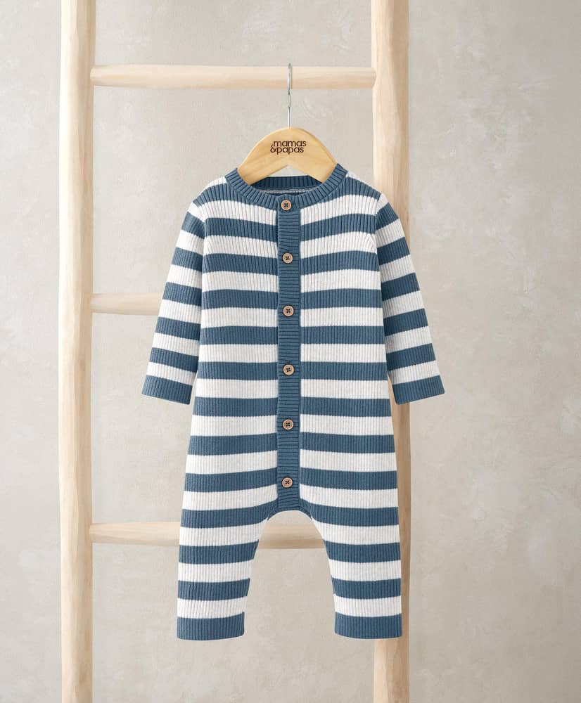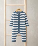 Ez a csíkos, kötött rugdalózó tökéletes alapdarab a kisbabád gardróbjába. A finoman bordázott gallér, ujj- és lábszélek extra kényelmet biztosítanak, miközben a kék és homokszínű árnyalatok igazán modern, letisztult megjelenést kölcsönöznek. A praktikus elülső gombos nyílás megkönnyíti az öltöztetést a mindennapokban.