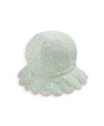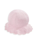 Könnyű, kifordítható, gyűrött dzsörzé kalap: Egyik oldala hibiszkusz mintával, a másik oldala rózsaszín. Hullámos szegéllyel készült.