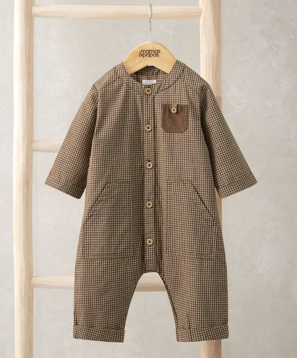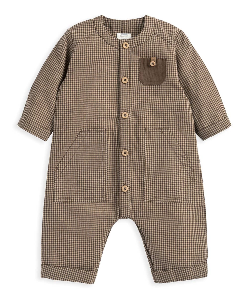 Ez a bájos, barna színű, kockás mintájú kezeslábas megkönnyíti a mindennapi öltöztetést, miközben egész napos kényelmet biztosít a kisfiúk számára.