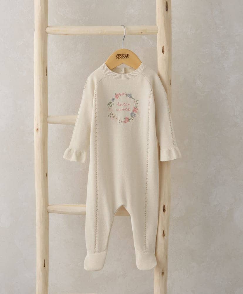 Kötött rugdalózó, bézs színben ‘hello world’ hímzett szlogennel. Horgolt részletek.