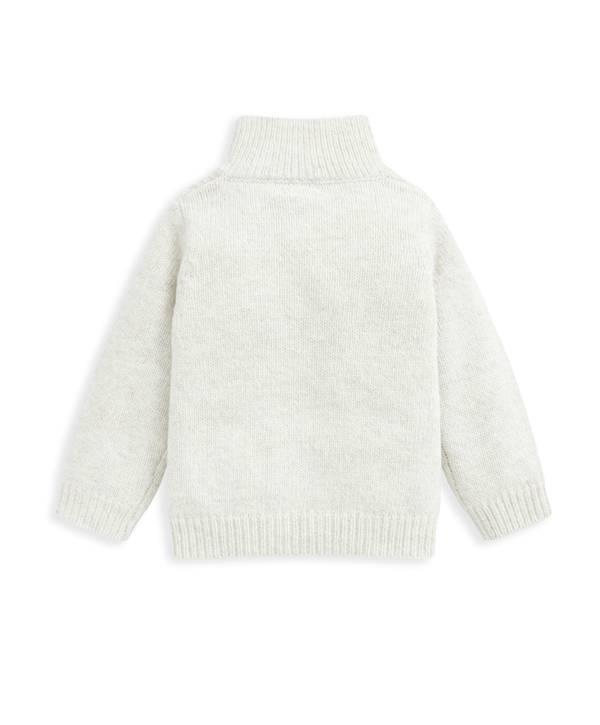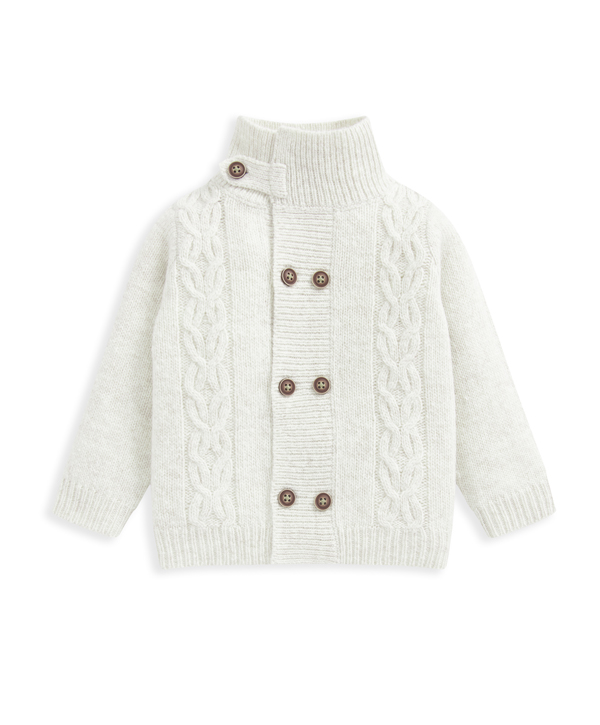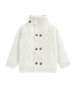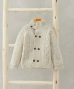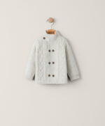 Ez a klasszikus, csavart mintás, magasnyakú kardigán tökéletes választás a hűvösebb napokra. A gyapjú keverékből készült anyag melegen tartja a kicsit, miközben időtlen stílust kínál – ideális réteges öltözködéshez.