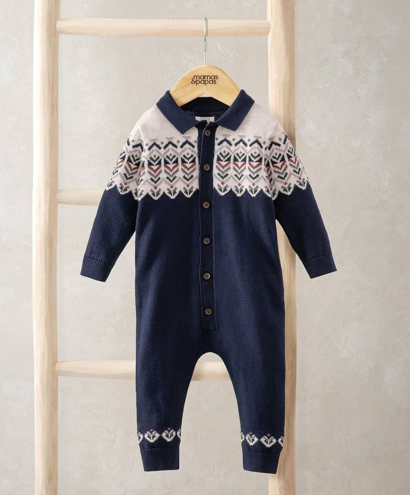 Ez a klasszikus skandináv mintás, jacquard kötésű rugdalózó tökéletes választás a mindennapi játékhoz vagy az ünnepi alkalmakhoz. A galléros kialakítás eleganciát kölcsönöz, miközben a puha pamutanyag kényelmet biztosít egész napra.
