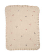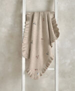 Ez a könnyű, lyukacsos hatású kötött takaró különleges díszítőeleme a finoman fodrozott szegély, amely elegáns megjelenést kölcsönöz neki. A természetes, földszínű alapon elhelyezkedő, hímzett mélykék bogyók és rózsaszín virágbimbók finom színfoltokat visznek a takaróba, megőrizve a letisztult, mégis bájos megjelenést.