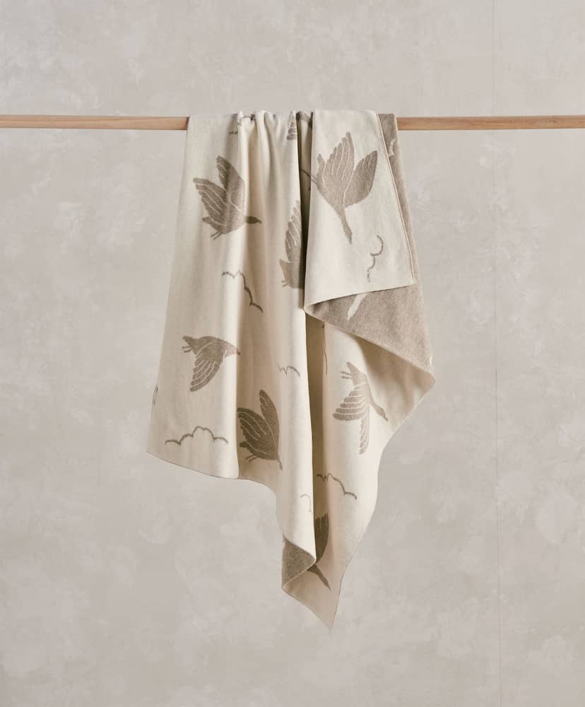 Könnyű, kötött pamut takaró, mokka barna és krém színekben, repülő kiskacsás sziluett mintával. A takaró mindkét oldala használható, ellentétes színekkel. Nagyon puha pamut anyagból készült.
