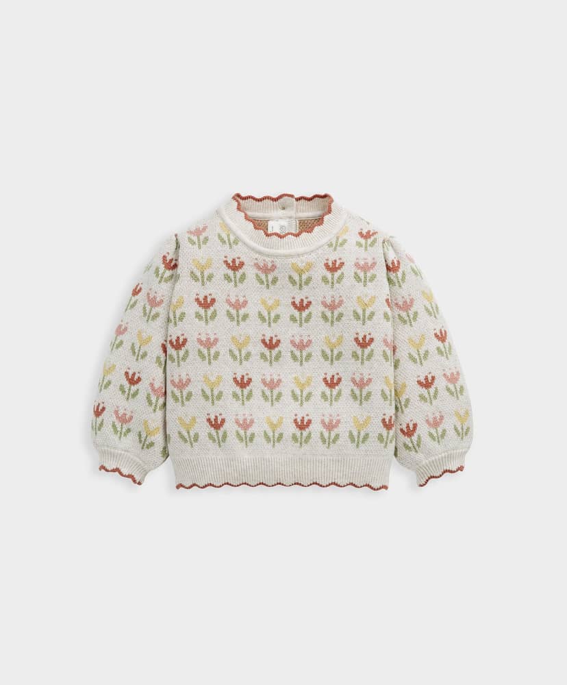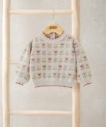 Ez a bájos, virágmintás kötött pulóver tökéletes választás a mindennapokra. A szezonhoz illő lágy színek és a finom, fodros szegélyek elegáns megjelenést biztosítanak, miközben a puha pamut anyag kellemes viseletet nyújt. A hosszú, ballon fazonú ujjak és a díszes gallér különleges részletekkel gazdagítják ezt a szerethető darabot.