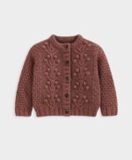 Kötött kardigán 3D kötésmintával. Fa hatású gombos rögzítéssel. Ballon alakú ujjak bordázott szegéllyel és mandzsettával.