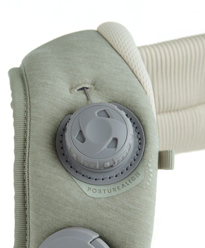 • Posture Align „kattintós” tekerőgomb integrált háttámasszal, amely finoman hátrahúzza a vállakat és elősegíti az egészséges hordozási testtartást