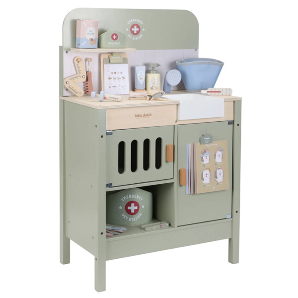 Megsérült a plüsskutya, fáj a cicus pocakja? A Little Dutch fából készült állatkórháza tökéletes helyszín a kis állatorvosok számára, hogy gondoskodjanak beteg játékmackóikról és kedvenceikről. A gazdagon felszerelt állatorvosi rendelőben minden szükséges eszköz megtalálható: lehúzható zuhanyfej mosdóval, hőmérő, fecskendő, fésű és sebtapaszok is a rendelkezésre állnak.