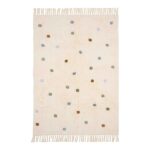 Vigyél melegséget a gyerekszobába egy Little Dutch szőnyeggel! A szőnyeg bézs alapszínét vidám kék, zöld és okkersárga pöttyök teszik még hangulatosabbá. A rövid oldalakon lévő rojtok játékos és otthonos megjelenést kölcsönöznek a szobának. 100% organikus pamutból készült, csúszásgátló latex aljzattal, így könnyen tisztítható mosógépben. Az erősebb minőségű pamut luxus megjelenést kölcsönöz.