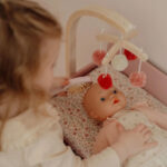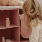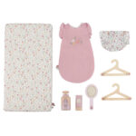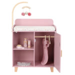 Little Dutch pelenkázó komód FSC Soft Flowers mintás kiegészítőkkel: fa mobil, puha pelenkázó matrac, fa gondozási kellékek, pelenka, hálózsák és vállfák – minden, amire szükség lehet egy baba gondozásához.