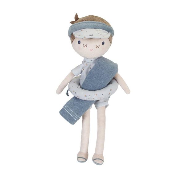 Ez a Little Dutch strandoló Jim baba készen áll a vizes kalandokra! Jim mindig vevő egy homokvár építésre vagy kincsek keresésére a parton: ő lesz gyermeked legjobb barátja, aki mindenben elkíséri és alig várja, hogy ő is az élmények részese legyen. Ölelnivaló szandálos plüss baba tengerészes úszóruhában, a hozzáillő napellenzős kalapban, úszógumival.