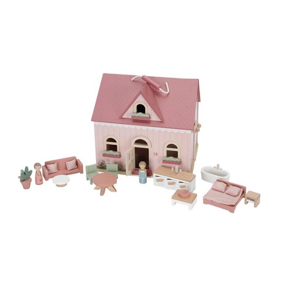 Ez a Little Dutch szétnyitható babaház gyönyörűen kidolgozott. Belsejében az alsó szinten nappali és konyha, az emeleten pedig hálószoba és fürdőszoba található. Egyszerűen nyitható-csukható és hordozható. A bútorok is a csomag részei. Tökéletes fa játék szerepjátékhoz, fejleszti a gyermek képzelőerejét.