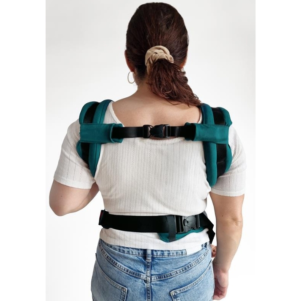 – A vállpántok hossza három helyen állítható, ezért elöl, és háton hordozásnál is kézre áll az állítás. A vállpánton legfelül is van állítási lehetőség, ami abban segít, hogy egészen kicsi és egészen nagy szülőknél is megfelelő helyzetben lesz a baba