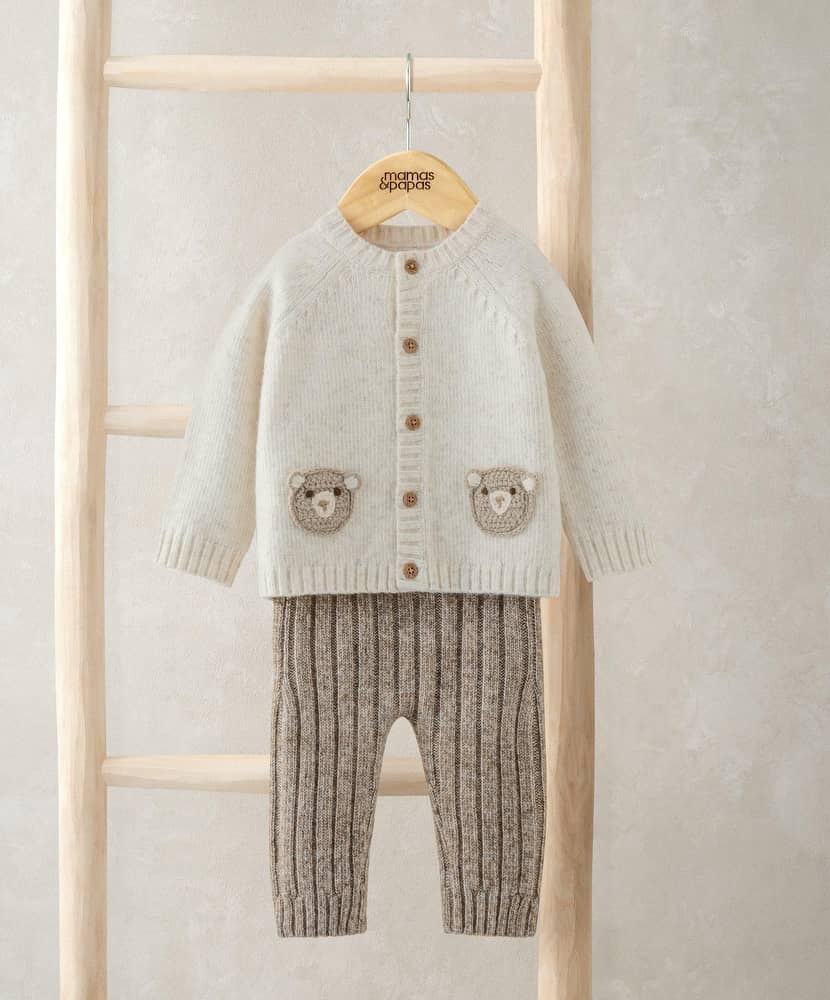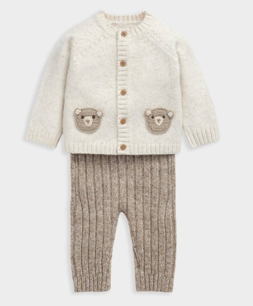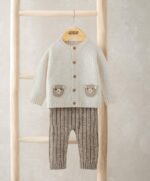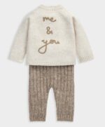 Ez a két darabból álló kötött szett tökéletes választás a hűvösebb hétköznapokra – puha, kényelmes és elragadóan bájos. A sodrott mintás, hosszú ujjú kardigánt a hátán lévő „Me & You” hímzett felirat és a mellrészen lévő kis medvearc díszíti, míg az elöl gombos kialakítás megkönnyíti az öltöztetést. A szetthez tartozó bordázott leggings puhán simul a baba bőréhez, így egész napos kényelmet biztosít.