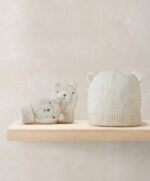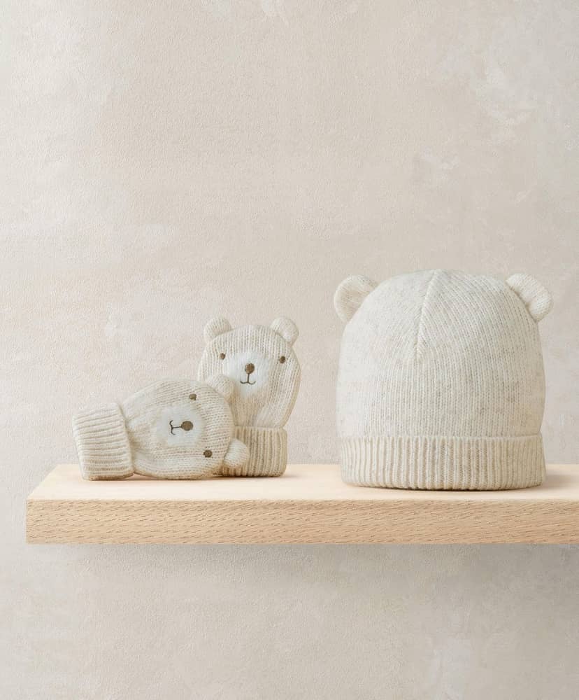 Ez a medvés kötött sapka és kesztyű szett nemcsak melegen tartja a kis fejecskéket és kezecskéket, hanem elragadó megjelenést is biztosít a hidegebb napokon. A puha anyagból készült sapkát bájos 3D fülek és visszahajtható passzé díszíti, míg a hozzáillő kesztyűk hímzett medvearc motívummal és bordázott mandzsettával készültek a tökéletes illeszkedésért és kényelemért.