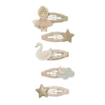A Mimi and Lula Balerina és hattyú csatok – 5 db-os szett varázslatos csillogással és álomszerű részletekkel hoz játékosságot minden frizurába. A bájos hattyúk, csillagok és felhők igazán különlegessé teszik ezt a szettet – tökéletes választás azoknak a kis álmodozóknak, akik imádják a csillogást és a mesés világot!