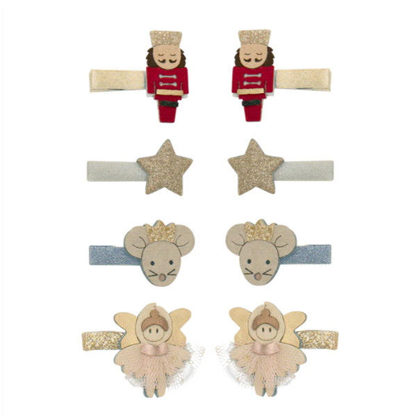 Mimi and Lula Diótörő mini csatok – 8 db-os szett ünnepi hangulatú, részletgazdag figurákkal díszített hajcsatok. Tökéletes választás kis táncosoknak vagy azoknak, akik a karácsony varázsát szeretnék viselni a hajukban.