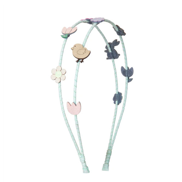 Mimi and Lula Húsvéti dupla hajpánt, varázslatos kiegészítő egy különleges kis “nyuszinak”. Nyuszik, margaréták, csibék és tulipánok díszítik, tökéletes húsvéti ajándék.