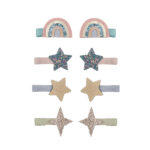 Gyönyörű pasztellszínű szivárvány és csillag formájú csatok, tökéletesen illeszkednek a finomabb hajú kislányok hajába is. 8 db-os szett, variálható stílusokhoz.