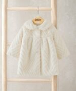 Ez a bájos, krémszínű műszörme kiskabát tökéletes választás az ünnepi alkalmakra vagy különleges családi programokra. A pihe-puha anyag kényelmes viseletet biztosít, miközben stílusos megjelenést kölcsönöz a kicsinek. A rejtett patentos záródásnak köszönhetően könnyen feladható és levehető, a hosszú ujjak és a puha bélés pedig gondoskodnak a melegségről a hűvösebb napokon is.