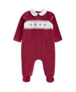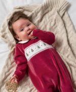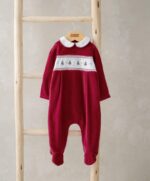 Piros bársonyy anyagú “Első karácsonyom” hímzéssel díszített, kerek galléros rugdalózó. Patentos rögzítés a könnyű pelenkázáshoz a hátonelrejtve.
