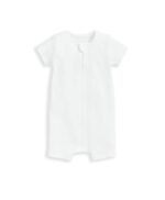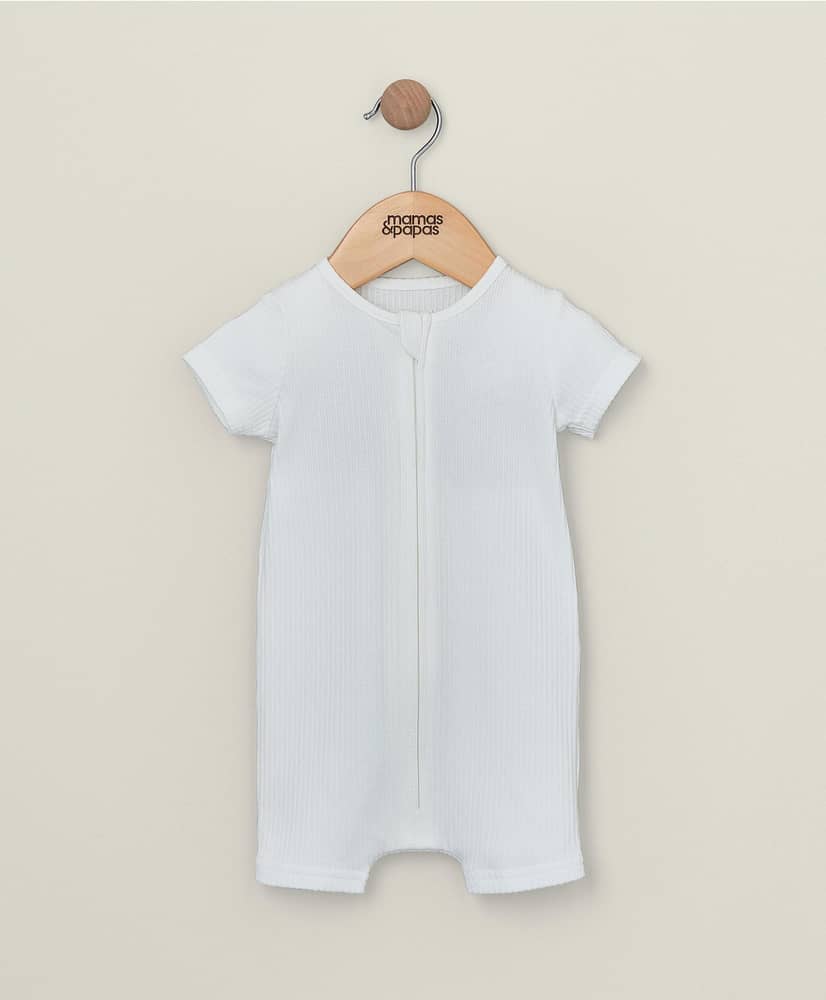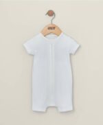Fehér rugdalózó organikus bordázott pamutból: Egyedülálló “növekedj velem” derékpánttal. Szőtt kitűző részlettel készült. Visszahajtható mandzsettákkal.