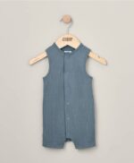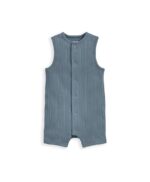 Ujjatlan kék rugdalózó, 100% organikus bordázott pamutból: Rejtett patentos nyílással elöl.