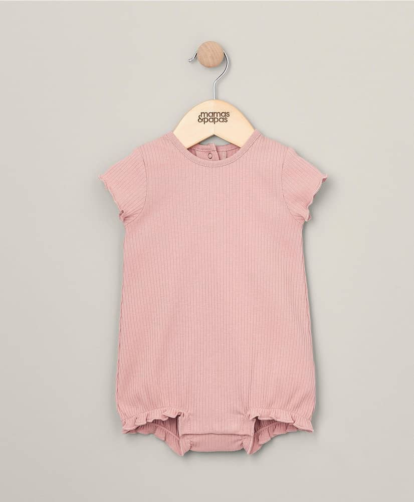 Rövid ujjú bordázott pizsama, 100% organikus pamutból: Fodros szegélyű ujjakkal és gumis fodros lábnyílásokkal. Rejtett patentos nyílással az ülepnél.