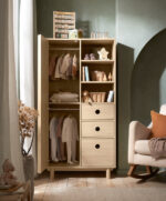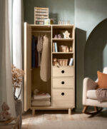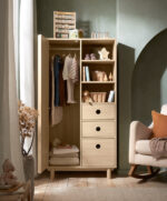 A beépített fiókok, az eltávolítható akasztórúd és a toló faajtók mögött elrejtett, állítható polcok segítenek mindent tökéletesen rendszerezni, miközben a tárolás a gyermek növekedésével is rugalmasan alakítható. A skandináv és japán design ihlette megjelenés, a meleg tölgyhatású árnyalatok, a lécezett részletek és a lágy ívek természetesen megnyugtató, modern hangulatot teremtenek.