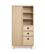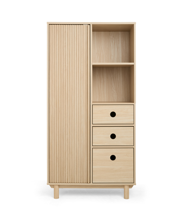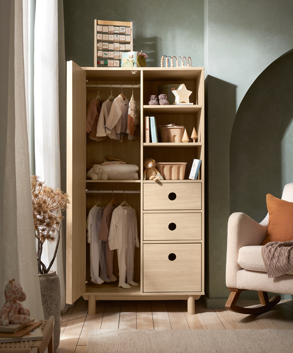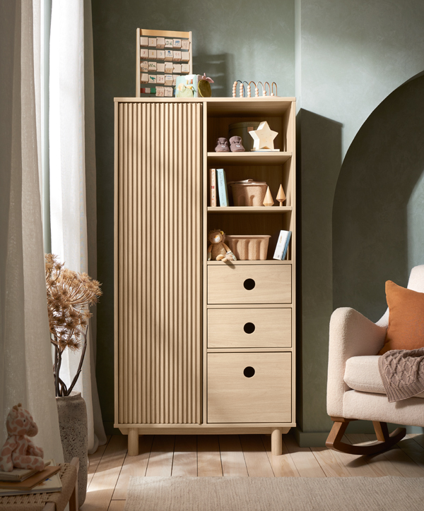 A különböző méretű fiókok és a nyitott polcok kombinációja átgondolt tárolást biztosít a babaápolási kellékektől és kiegészítőktől kezdve a ruhákig, a babakortól a kisgyermekéveken át. A finoman záródó ajtók és fiókok megőrzik a nyugodt babaszobai hangulatot, míg a meleg tölgyhatású árnyalatok, a lécezett részletek és a lágy ívek – skandináv és japán design ihletéssel – letisztult, modern megjelenést teremtenek.