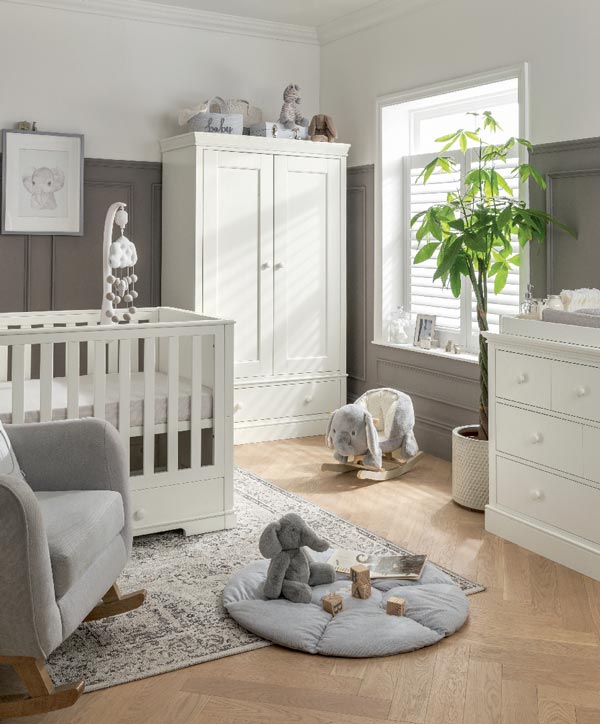 A Mamas & Papas egyik impozáns kollekciója: az elegáns nemzeti örökség részleteit hordozza, feltűnő szekrénypárkányok és lábazat, festett fehér szín jellemzi. Robusztus megjelenésű, hagyományos stílust kelt a babaszobában. A 3 részes bútorcsomag egy baba/gyerekágyat, egy pelenkázó komódot és egy szekrényt tartalmaz.