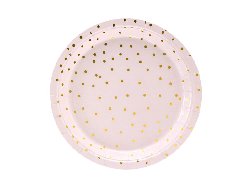 Rózsaszín, 18 cm-es, arany pöttyökkel díszített party tányér. Tökéletes party kellék egy igazi csajos buliba.