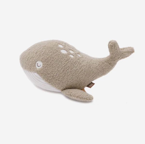 Puha bálna formájú aktívjáték bouclé és gyapjú anyagból. Gyürkészésre hangot adó uszonyokkal és csörgővel a hasában, amely szórakoztató és fejlesztő élményt nyújt babádnak.