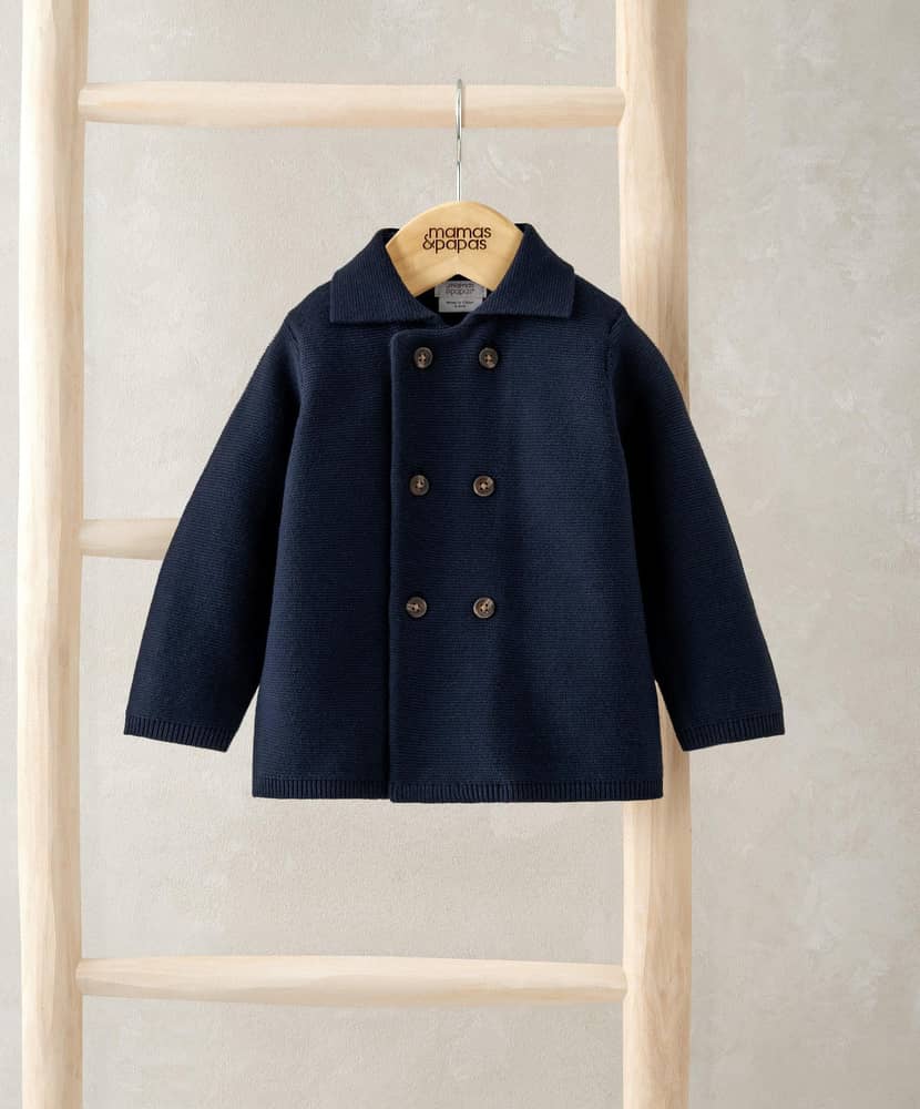 Ebben a sötétkék, galléros kötött kardigánban gyermeked egyszerre lesz elegáns és komfortosan öltözött. A dupla gombos kialakítás és a puha pamut anyag tökéletes választás a hűvösebb napokra – akár réteges öltözködéshez, akár különleges alkalmakra.