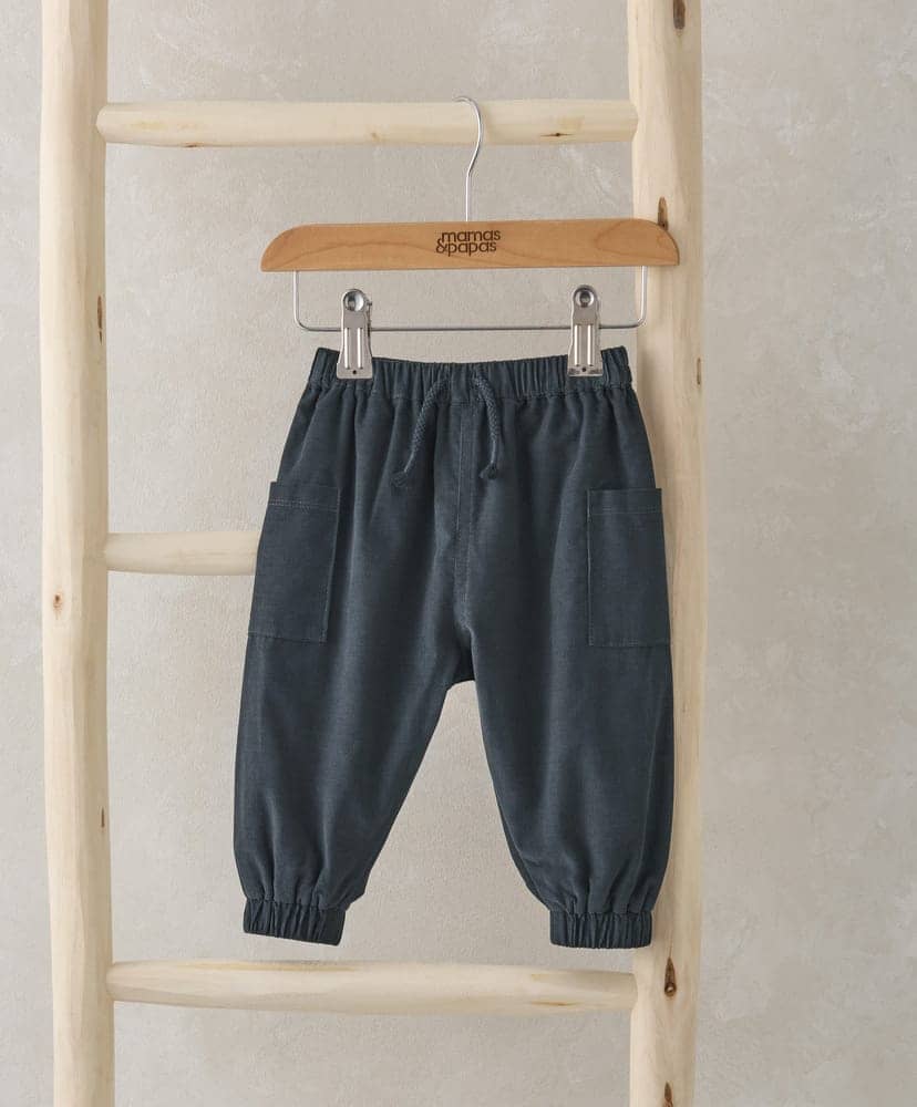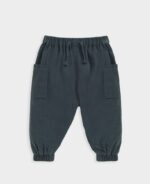 Sötétkék kord melegítőnadrág. Rugalmas derékpánt álhúzózsinórral. Rugalmas szármandzsetta a kényelemért.