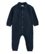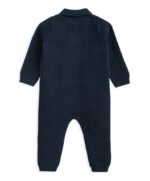 100% kötött pamut kék kezeslábas gallérral. Dísz gombokkal. Belső lábszárnyílással ellátott patentos rögzítés.