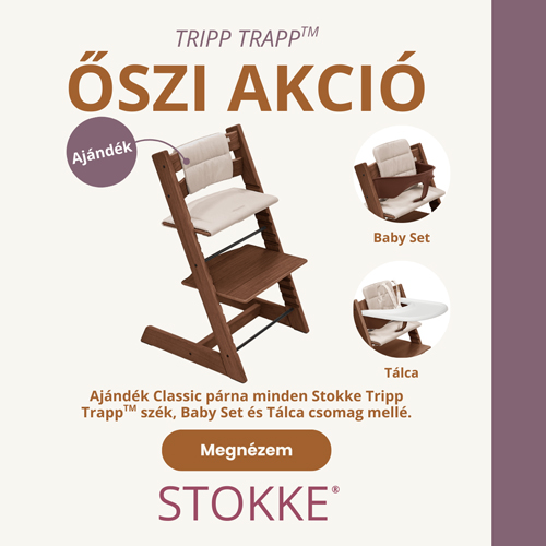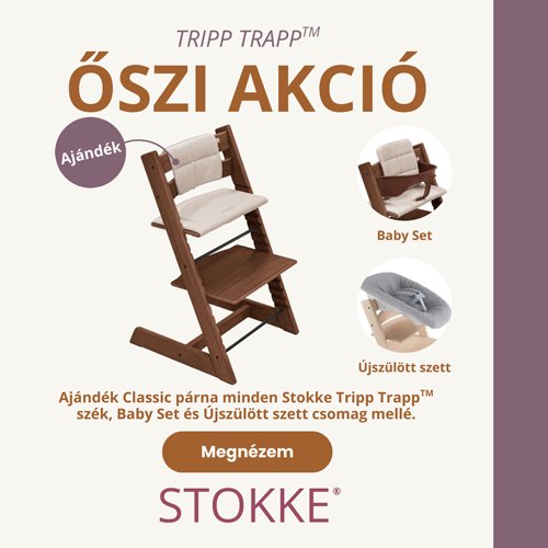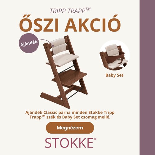 *Az ajánlat bármely Stokke Tripp Trapp szék vásárlásakor érvényes 2025.09.26-tól 2025.10.26-ig, vagy a készlet erejéig. A Stokke Tripp Trapp Classic Párna eredeti ára 19.990-22.990 HUF. Az akció más kedvezménnyel nem összevonható.