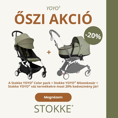 *Az ajánlat bármely Stokke YOYO3 váz, YOYO 6+ Color Pack és YOYO mózeskosár együttes vásárlásakor érvényes 2025.09.26-tól 2025.10.26-ig, vagy a készlet erejéig. A Stokke YOYO3 váz eredeti ára 161.990, a Stokke YOYO 6+ Color Pack eredeti ára eredeti ára 28.990-53.990, a Stokke YOYO mózeskosár eredeti ára 105.990 HUF. Az akció más kedvezménnyel nem összevonható.