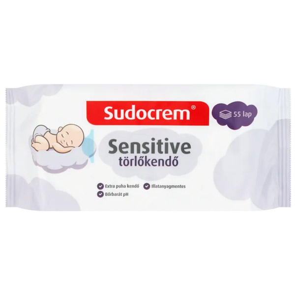 Sudocrem sensitive törlőkendő extra puha, bőrápoló panthenollal és E-vitaminnal, a baba egész testén használható, illatanyag-mentes.