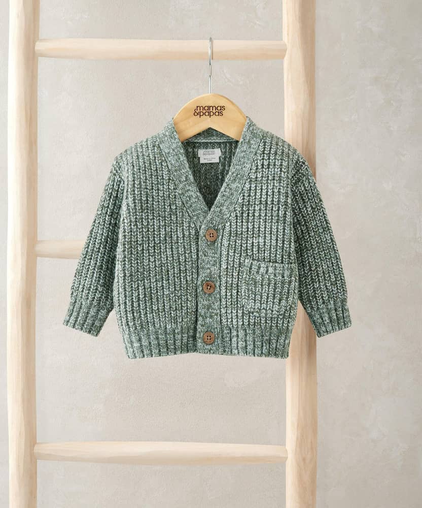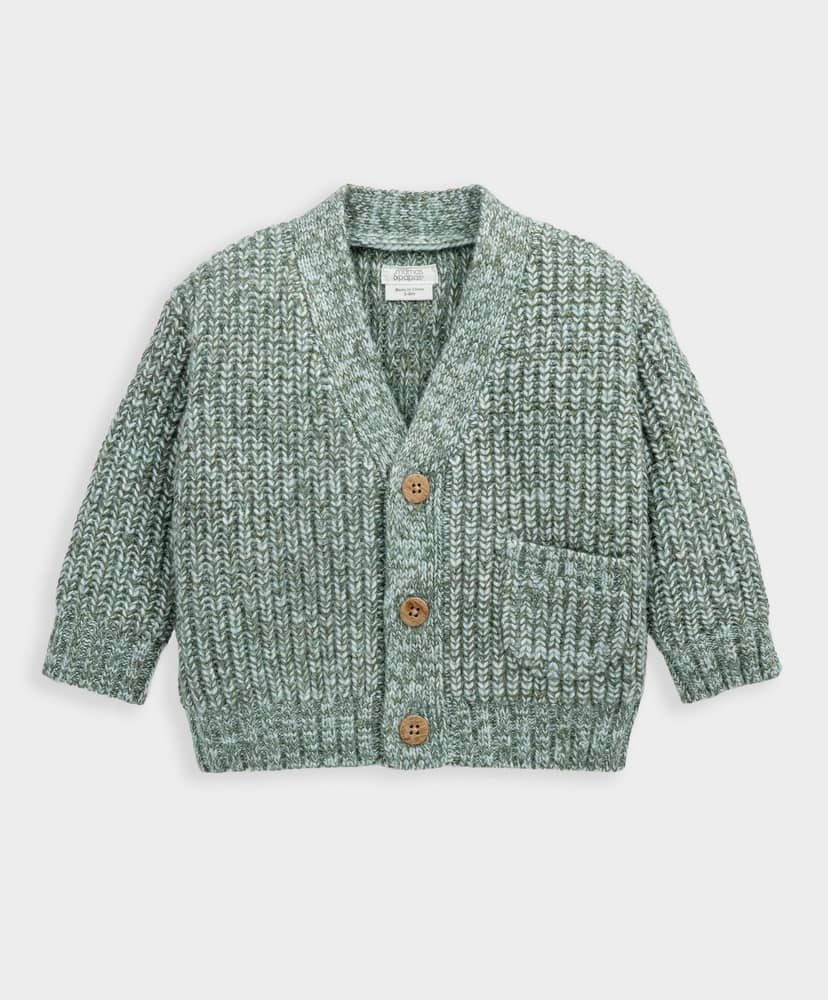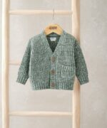 Ez a puha, vastag kötésű kardigán tökéletes választás a hűvösebb napokra. A klasszikus csavart minta és a kontrasztos szegélyek elegáns, mégis kényelmes megjelenést biztosítanak. A praktikus elülső gombos záródás és a kis kötött zseb igazán különlegessé teszik ezt a rétegezésre ideális darabot.