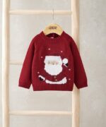 Ez a klasszikus piros kötött pulóver igazi ünnepi hangulatot teremt a kisgyermekek ruhatárában! A vidám Télapó minta és a 3D pompom részlet garantáltan mosolyt csal mindenki arcára. A bordázott gallér, mandzsetta és szegély kényelmes viseletet biztosít, míg a hátsó gombos záródás megkönnyíti az öltöztetést. Tökéletes választás a karácsonyi családi eseményekre vagy az első ünnepi fotózásra!