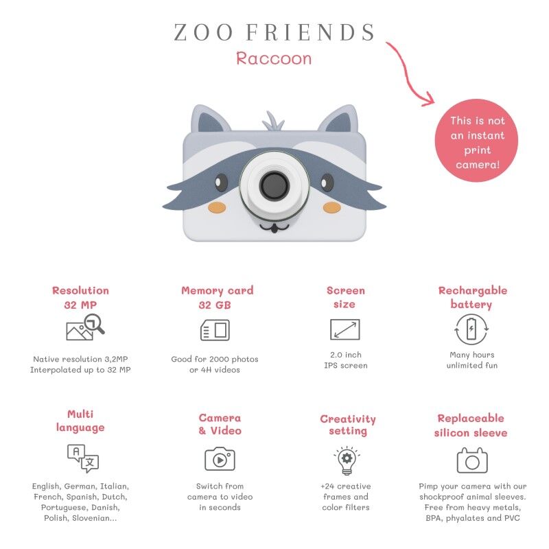 Ez a The Zoofamily által készített 32 megapixeles Zoo Friends digitális gyerek fényképezőgép és videokamera hihetetlenül cuki, kicsi és könnyű. A PVC-mentes, ftalát-mentes és környezetbarát anyagból készült szilikon borítás nemcsak imádnivaló, hanem védelmet is nyújt az esetleges leeséssel szemben, megőrzi a kamera tisztaságát, könnyen levehető és tisztítható. A beépített újratölthető akkumulátornak köszönhetően órákon át működhet töltés nélkül. Teljesen feltöltve több mint 2000 fényképet készíthettek vagy körülbelül 4 órán át rögzíthettek videót.