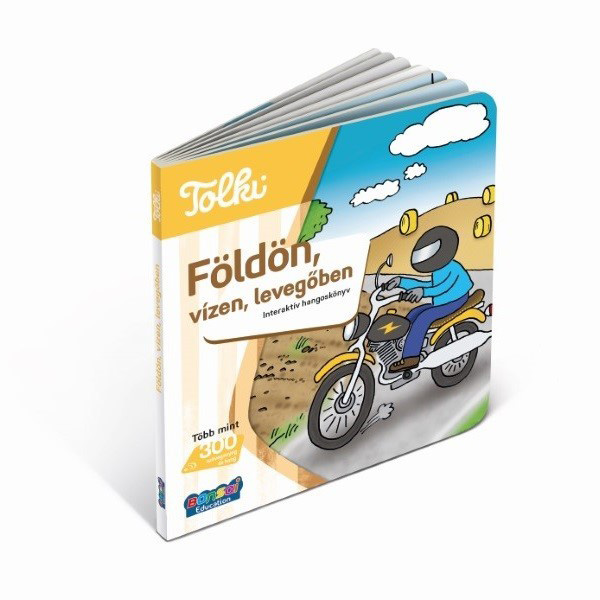 A Tolki Interaktív hangoskönyv-Földön, vízen, levegőben 12 oldalon mutatja be a gyerekeknek a járművek világát a traktortól a villamoson át egészen a repülőgépig. A vidám képekhez kedves, érthető magyarázatok és versek tartoznak. A könyv narrátora Farkasházi Réka. A könyv játékos formában ad át fontos, a hétköznapi életben használható ismereteket, valamint fejleszti a gyerekek képzelőerejét, hallás utáni szövegértését, szem-kéz koordinációját, memóriáját és logikai képességeit is.
