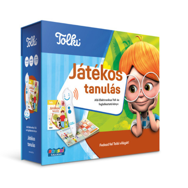 A Tolki Játékos tanulás -interaktív könyv szettben TOLKI segítségével a gyerekek szórakoztató módon ismerkedhetnek meg a számokkal, betűkkel, színekkel, formákkal, a hétköznapi életben előforduló szituációkkal, az évszakokkal és sok minden mással. A szett tartalmazza a könyvben szereplő ábrákhoz elektronikusan rögzített szövegek felolvasására szolgáló eszközt, és az annak feltöltéséhez szolgáló elektromos töltő berendezést is.