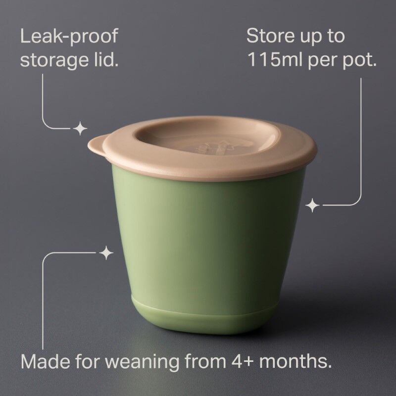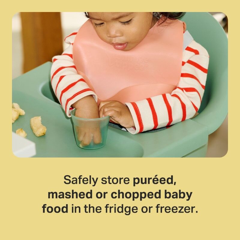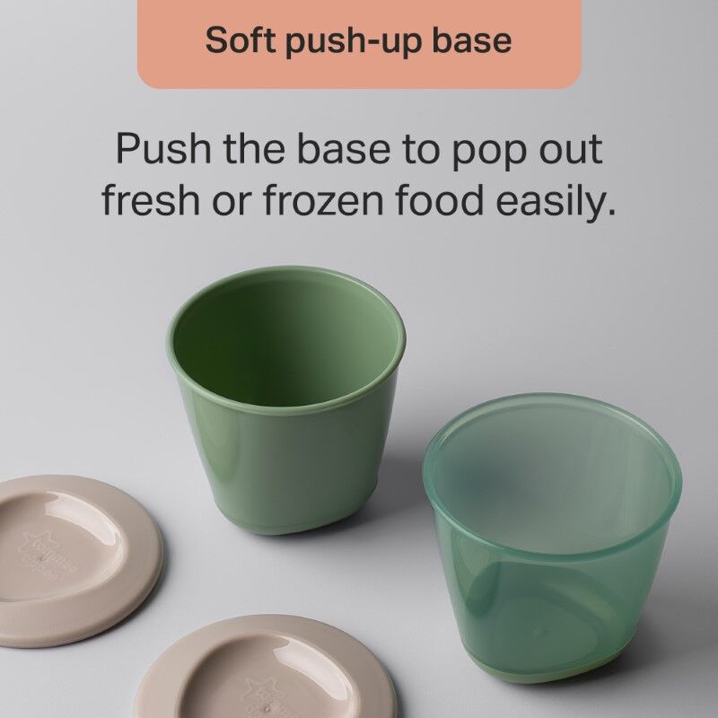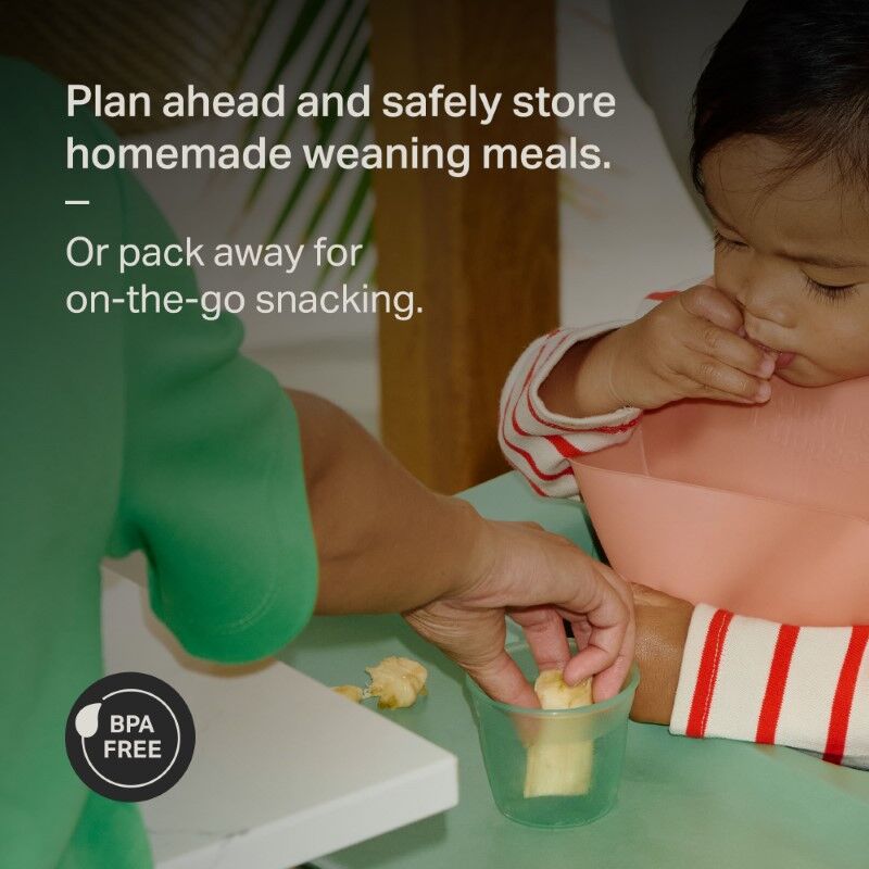 Az otthon elkészített bébiétel könnyedén és biztonságosan eltehető ebbe a praktikus Ételtároló edénykébe (Pop-ups weaning pots). Ha túl sok lett a leturmixolt püré, az edényben későbbi felhasználásig lefagyasztható. Egyedi, puha aljának köszönhetően a fagyott ételt is könnyedén ki lehet nyomni belőle. Ideális mennyiségű étel befogadására alkalmas, 120 ml fér bele. A gyermek meg is etethető belőle, háromszög alakú aljából könnyen kikanalazhatók még az utolsó falatok is, nem kell többé kergetni a borsószemeket.
